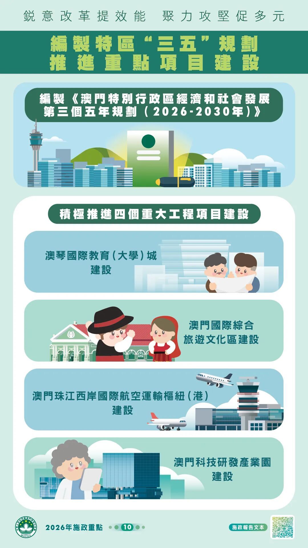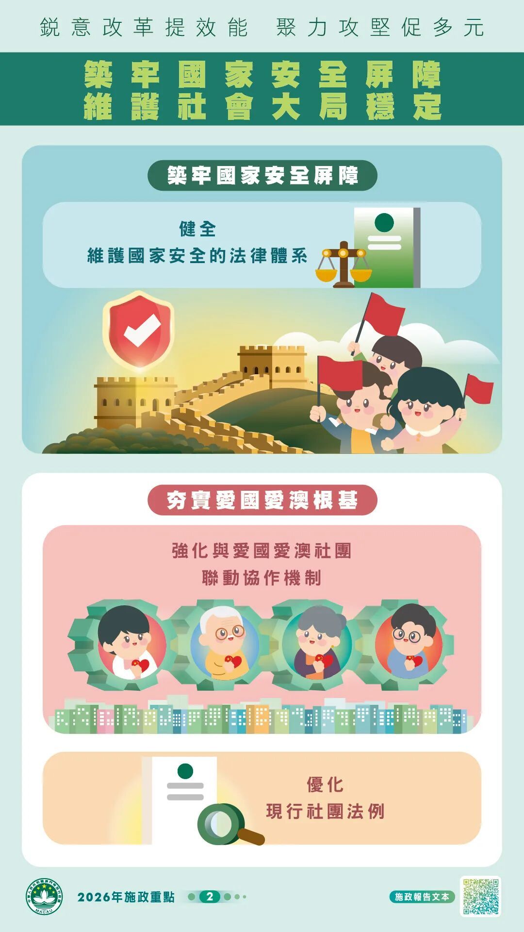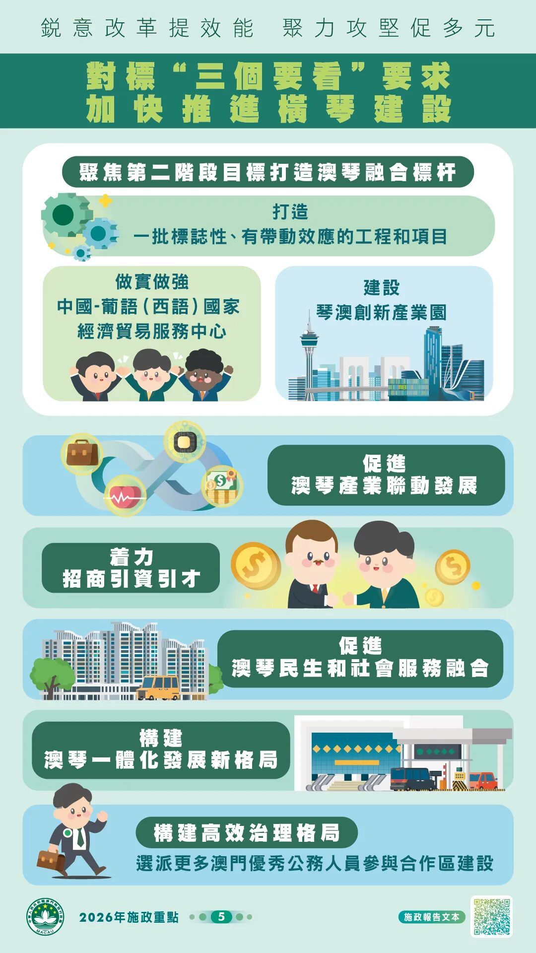 《2026年施政報告》主題為“銳意改革提效能 聚力攻堅促多元”。特區政府將從以下多個方面開展施政工作: