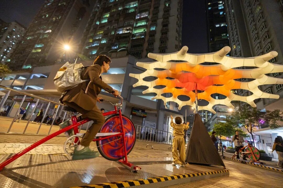 美國跨學科藝術與設計工作室Pneuhaus在飛喇士街休憩區帶來由發光樹狀雕塑組成的藝術燈光裝置“Canopy”。參與者可通過腳踏車發電機為燈光裝置供電,隨着能量的注入,頂部燈光氣膜將綻放,呈現一片葡式花磚組成的森林。