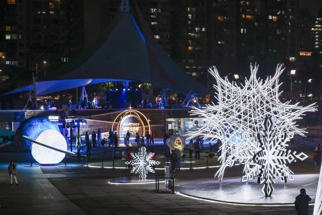 南灣區“星光・航路”於南灣湖水上活動中心的燈光裝置《雪絨星》,由北京清華大學建築學院長聘副教授黃蔚欣創作,以“編織式空間網殼”等技術創造輕盈、透光且具表現力的公共藝術裝置。