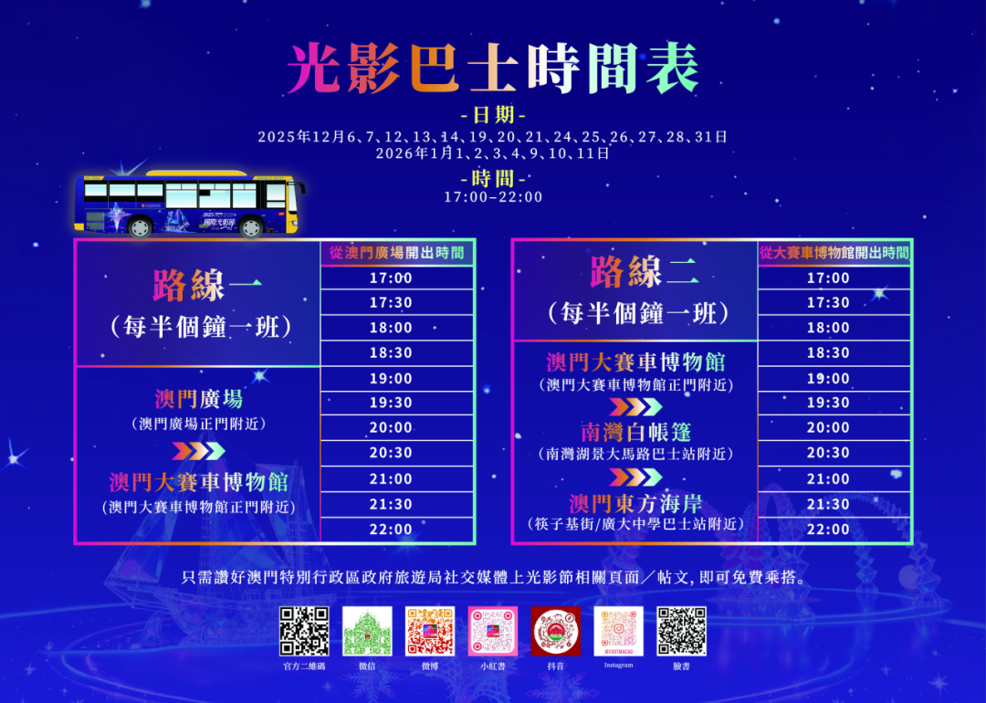 為了方便大家體驗各區特色裝置和活動,這次特別設有兩條免費“光影巴士巡遊”路線串聯各區:“引流線”從中區國際銀行出發至新口岸區;“巡迴線”則穿梭三大展區,出行打卡超方便~