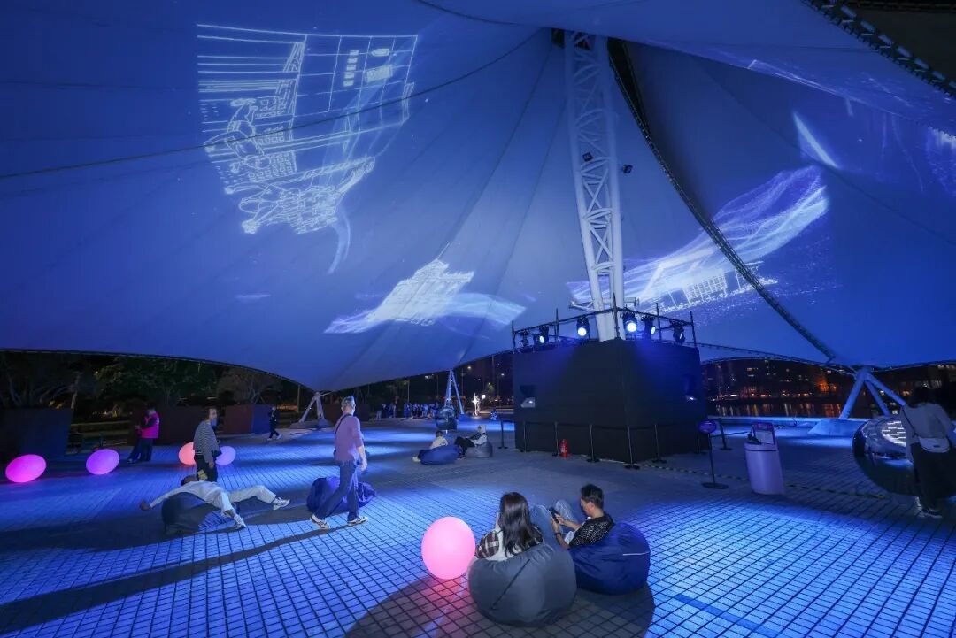 由澳門本地藝術家陸曦主理的《十二星座圖譜》燈光裝置,將南灣白帳篷穹頂變成一片投影畫布,通過互動裝置選擇心願祝福語,化作一道道星光升起躍上天幕,與無數星辰一同閃爍。