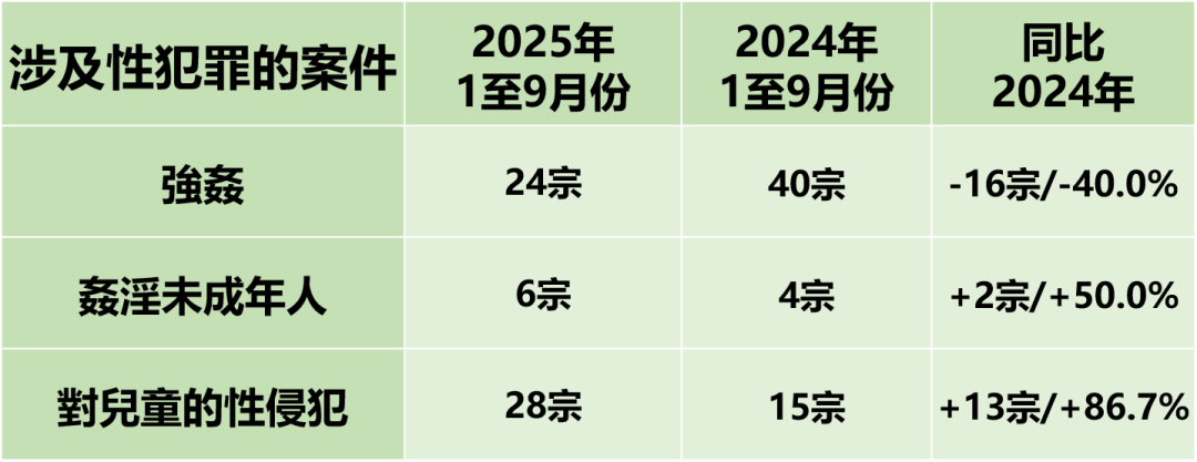 今年首三季,強姦案件共有24宗,較去年同期減少16宗,大幅下降百分之40,其中超過七成的受害人為非本澳居民,案發地點主要在酒店房間內,部份案件受害人與嫌疑人存有金錢糾紛,不排除由性交易衍生。警方透過“酒店業警務聯絡機制”及“酒店業界治安通報機制”與酒店業保持緊密溝通,持續加強酒店及娛樂場周邊的警力部署與巡查工作,於2025年1月至9月共開展160多次打擊操縱賣淫等不法活動的相關行動,截獲192名懷疑賣淫人士,並偵破17宗淫媒或操縱賣淫案件,涉及嫌犯26人。