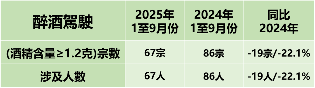 今年首三季檢控醉酒駕駛共67宗,較2024年同期減少19宗,下降百分之22.1。