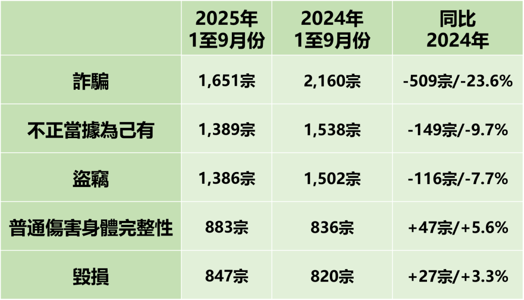 其中,“詐騙”共1,651宗,“不正當據為己有”共1,389宗,“盜竊”共1,386宗,“普通傷害身體完整性”共883宗,“毀損”共847宗。