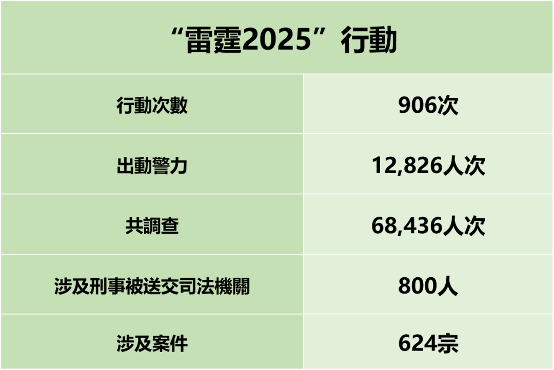 為淨化大灣區治安環境,粵港澳三地警方於今年下半年共同開展“雷霆2025”聯合執法行動。本澳方面,警察總局統籌治安警察局和司法警察局,並聯同澳門海關,於8月至10月期間,分兩階段開展行動,共進行906次巡查,動用警力12,826人次,調查68,436人次,其中800人因觸犯刑事案件而送交司法機關處理,涉及案件共624宗。