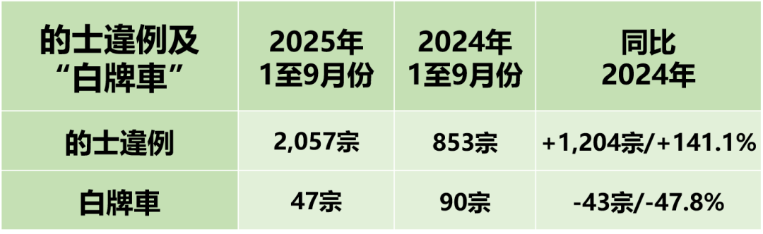 交通執法方面,治安警察局聯同交通事務局於今年1月至9月合共檢控的士違規個案2,057宗(其中治安警察局檢控個案共1,596宗)。