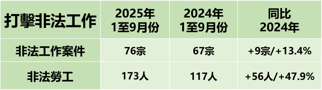 治安警察局持續加強對非法工作的打擊力度,重點關注非法“約拍”及演唱會“黑工”等情況,於2025年1至9月,獨立或聯同勞工事務局等其他部門開展相關行動共875次,合共巡查近3,000個地點或場所,查獲517名非法工作者及60名僱用非法勞工的僱主。