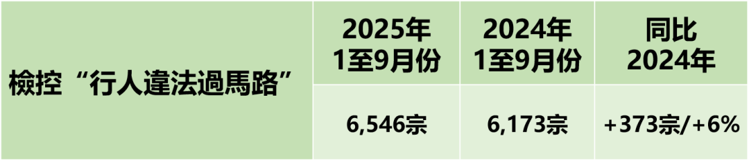 “行人違法過馬路”共有6,546宗,較去年同期上升約百分之6。治安警察局在全澳各區持續開展巡查工作,監察及打擊行人違規行動。