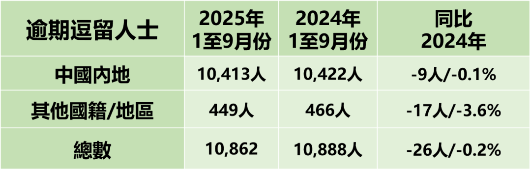 今年首三季逾期逗留人士有10,862人,較2024年同期減少26人,下降百分之0.2。