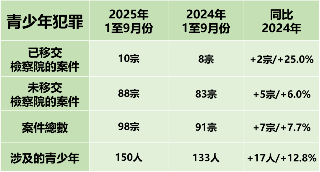 今年首三季青少年犯罪案件共98宗,較2024年同期增加7宗,上升百分之7.7;涉及的青少年共150人,較2024年同期增加17人,上升百分之12.8。