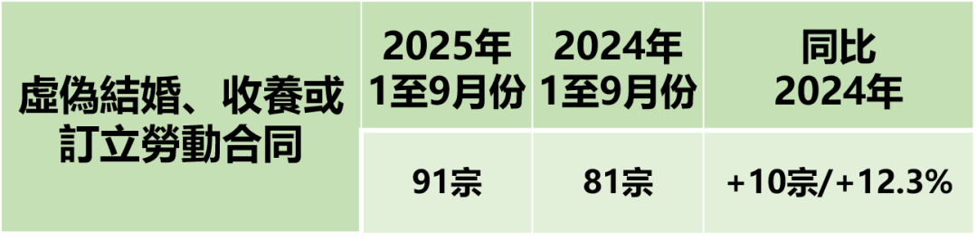 俗稱“假結婚”的虛偽結婚案件共45宗,比2024年首三季增加13宗。警方將繼續強化與身份證明局及周邊地區警方的聯繫與協作,對懷疑個案進行深入調查,重點打擊相關犯罪集團及違法中介,同時循多渠道進行宣傳,提醒公眾切勿實施相關犯罪行為。