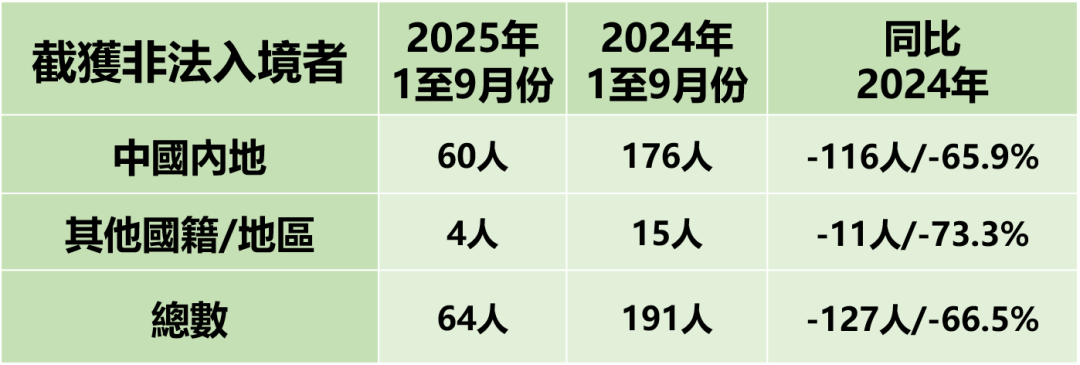 今年首三季截獲的非法入境者共64人,比2024年同期減少127人,大幅下降百分之66.5。