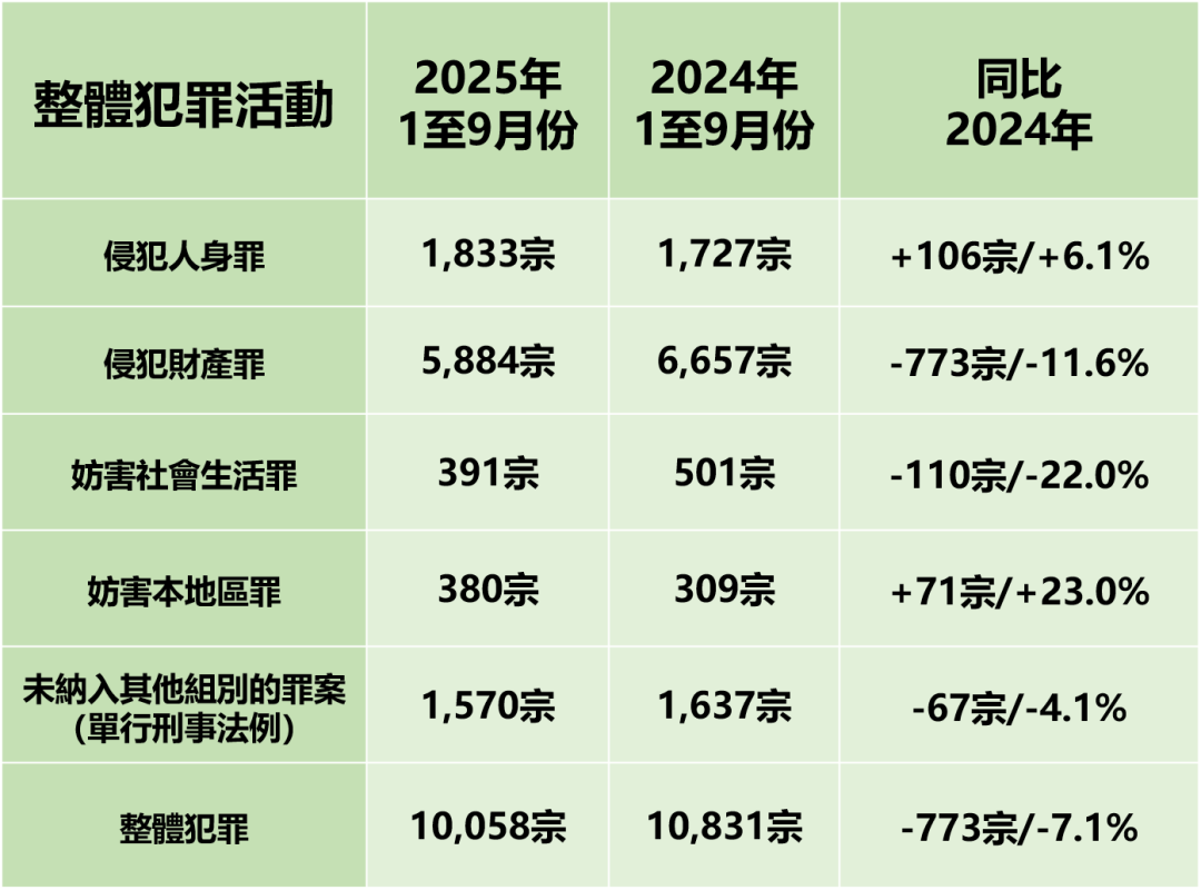 2025年1月至9月警方共開立刑事專案調查案件10,058宗,較2024年同期減少773宗,下降百分之7.1。