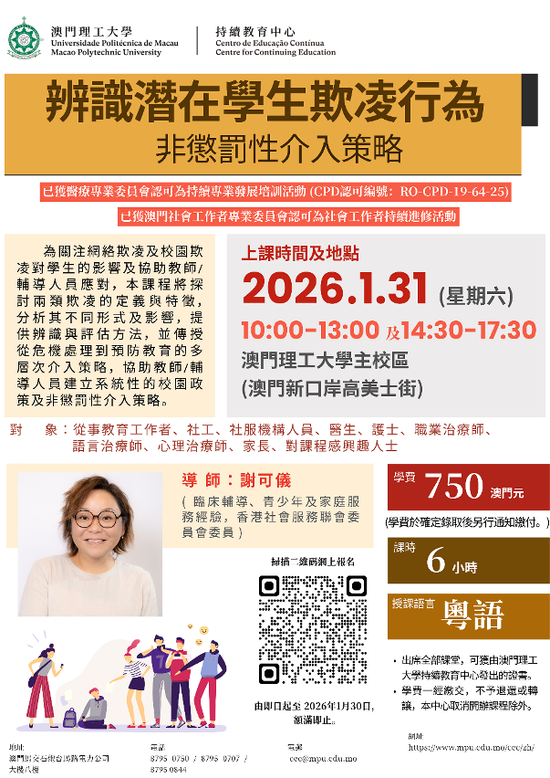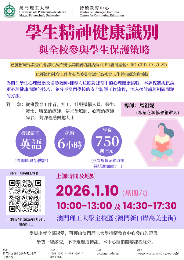 為助力提升對青少年的關愛氛圍,加強校園和社區的輔導支援力度,澳門理工大學持續教育中心將於 2026年1月開辦兩項培養青少年實務課程 —“學生精神健康識別與全校參與學生保護策略”及“辨識潛在學生欺凌行為與非懲罰性介入策略”課程,導師為港澳資深社會工作專家。課程分別獲澳門醫療專業委員會及社會工作者專業委員會認可為持續專業發展(CPD)培訓活動,歡迎教育工作者、社工、社服機構人員、醫護人員、治療師、相關專業人士及對課程感興趣人士報讀。