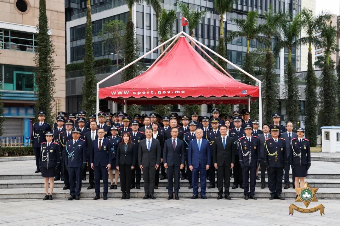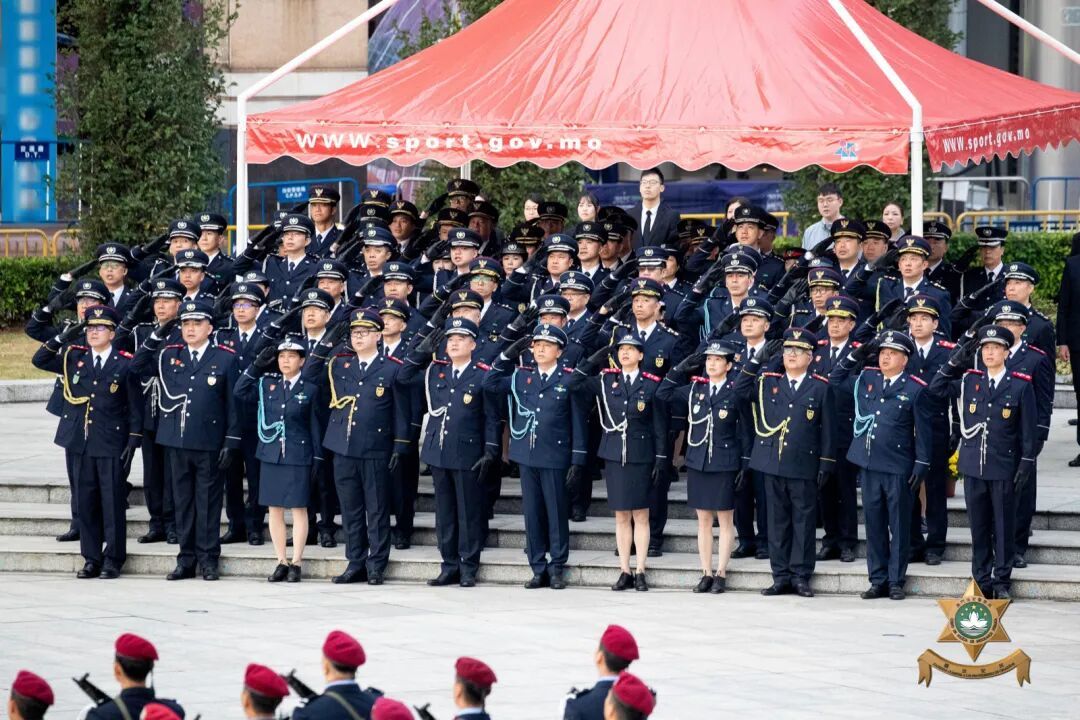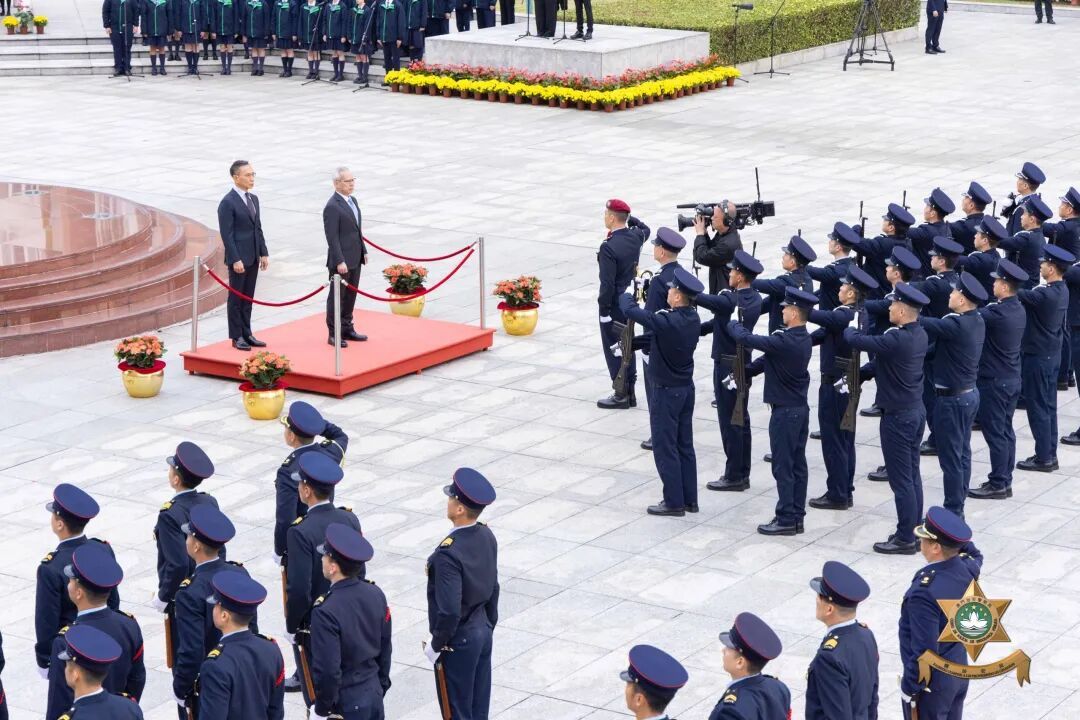 行政長官岑浩輝在保安司司長陳子勁陪同下,接受由澳門海關、治安警察局及消防局組成的儀仗隊敬禮。