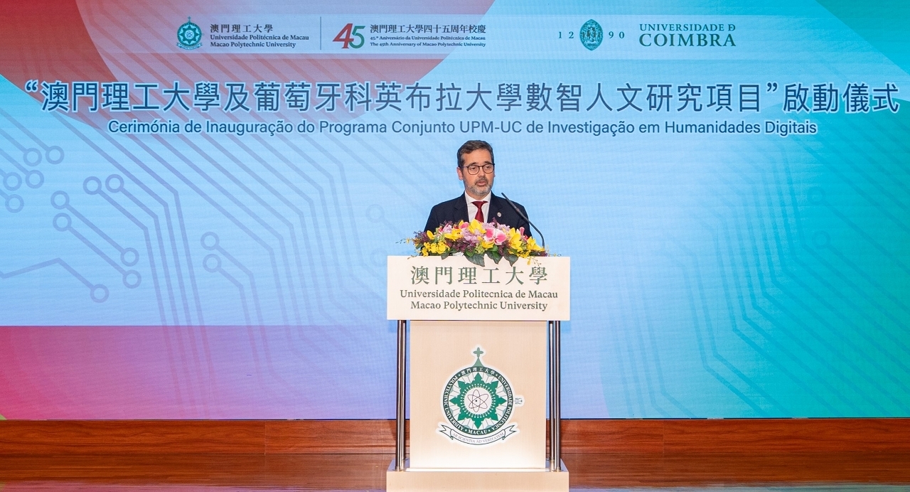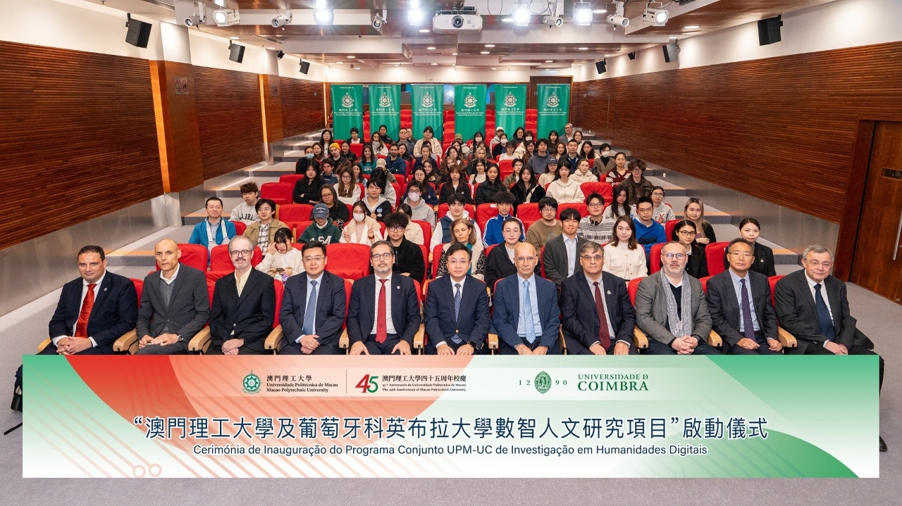 數智人文聯合科研項目將匯聚兩校優勢,開展多維度科研創新,重點推動中葡人文學術研究,涵蓋歷史檔案數字化、葡語大語言模型與人工智能研發、文化遺產的數智活化及當代數字傳播等方向。出席啟動儀式的嘉賓尚包括:葡萄牙科英布拉大學總圖書館館長曼努埃爾·波爾特拉(Manuel Portela)、信息工程系主任安東尼奧·門德斯(António Mendes)、教授雨果·奧利維拉(Hugo Oliveira)、人類學博士課程協調員、生命科學系教授貢卡洛·桑托斯(Gonçalo Santos)、全球項目協調員裏卡多·迪亞斯(Ricardo Dias);澳門理工大學語言及翻譯學院院長張雲峯、副院長高若今(Joaquim Carvalho)、國際漢語教育學士學位課程主任杜志軍,以及葡語教學及研究中心主任魯伊·伽馬(Rui Gama)等。
