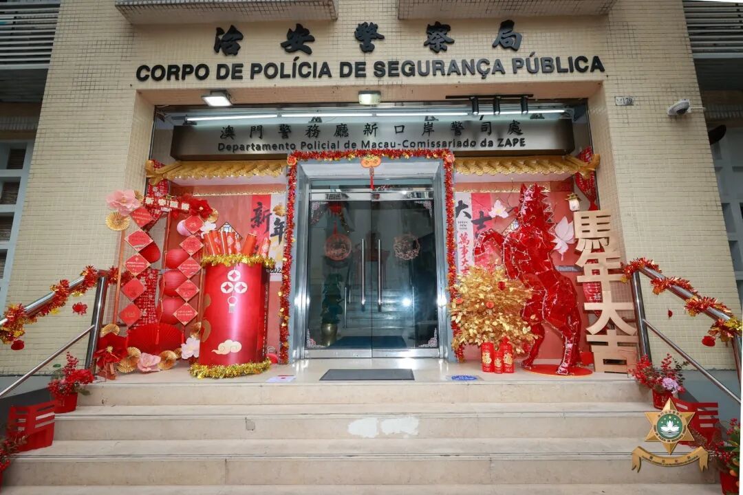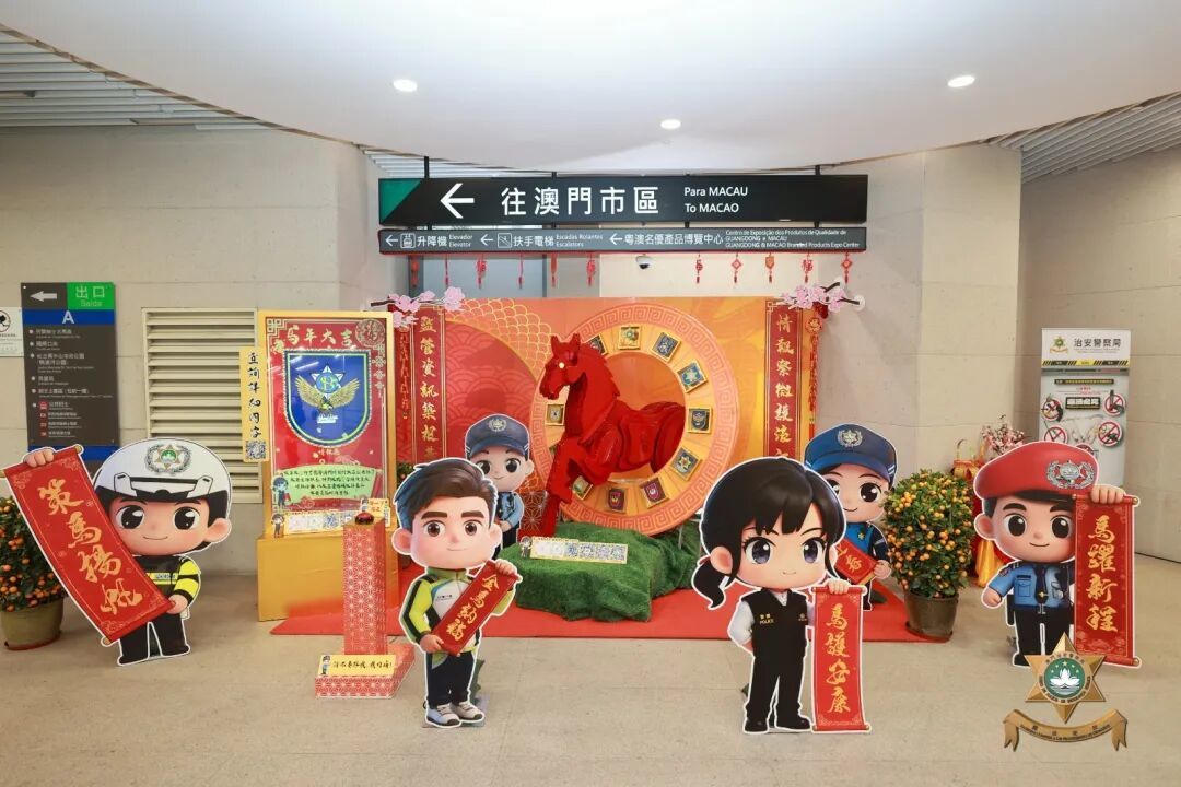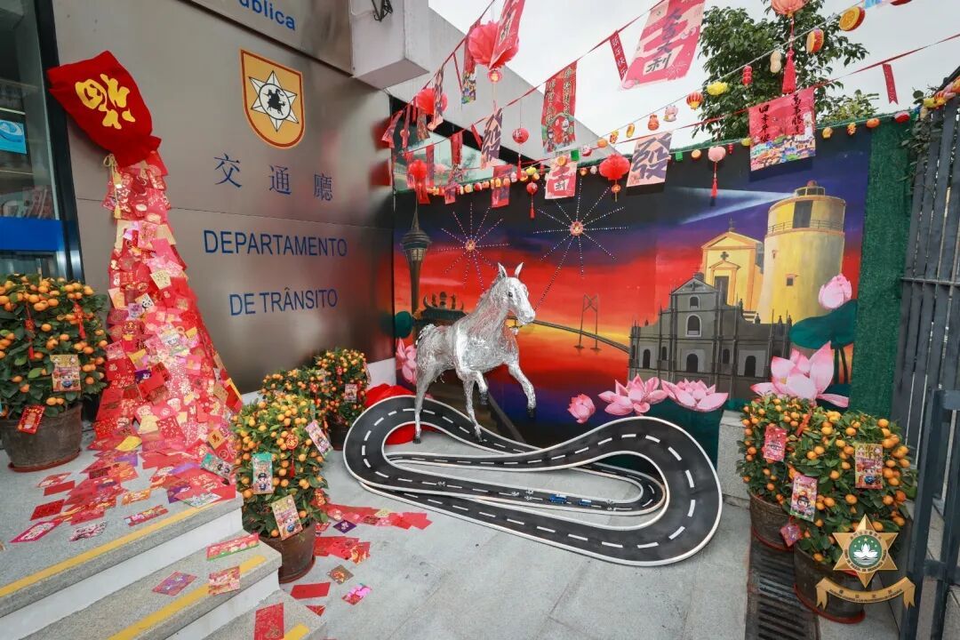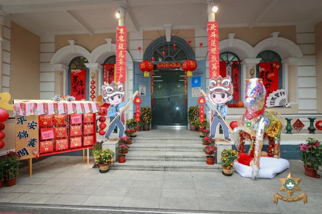 門前設置佩戴舞龍舞獅造型頭盔的警員立牌,門體兩側窗户懸掛馬年主題祝福揮春;左側“平安錦囊”互動裝置,以直觀形式向市民傳遞安全防範資訊;右側環保材質製作的“平安駿馬”裝飾,象徵警隊高效務實、可靠守護的工作作風。