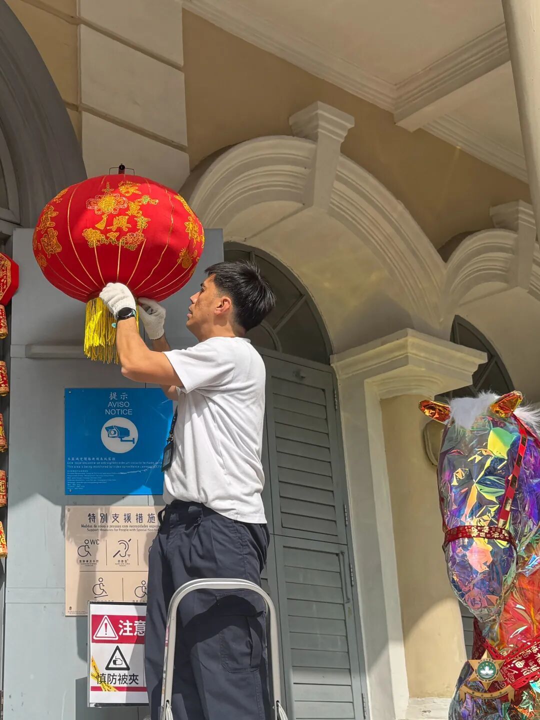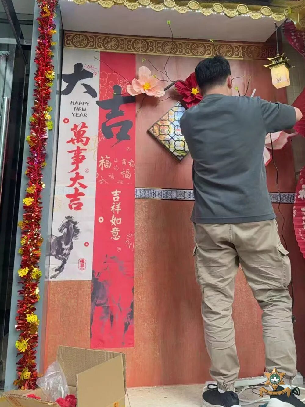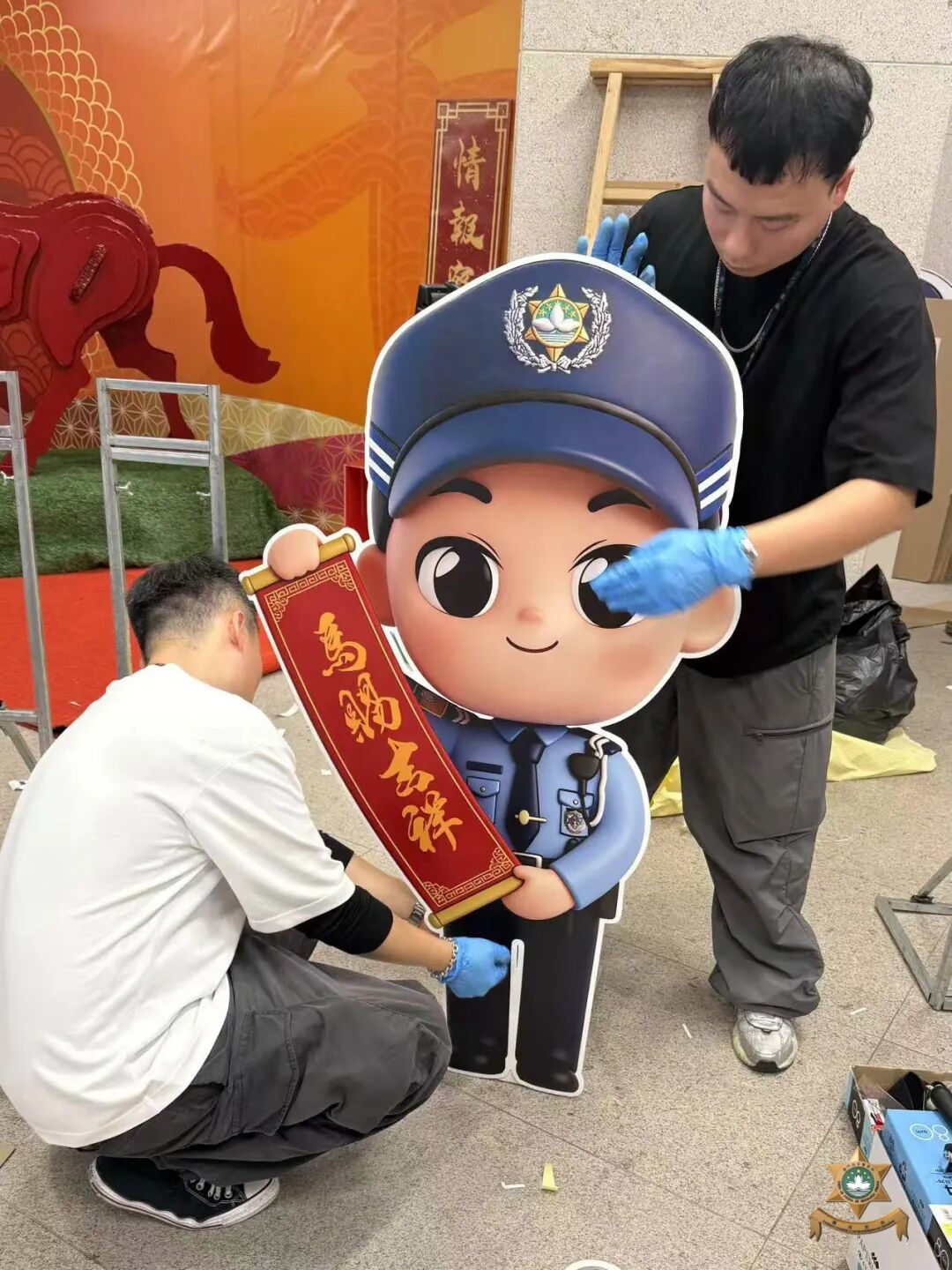 門前設置佩戴舞龍舞獅造型頭盔的警員立牌,門體兩側窗户懸掛馬年主題祝福揮春;左側“平安錦囊”互動裝置,以直觀形式向市民傳遞安全防範資訊;右側環保材質製作的“平安駿馬”裝飾,象徵警隊高效務實、可靠守護的工作作風。
