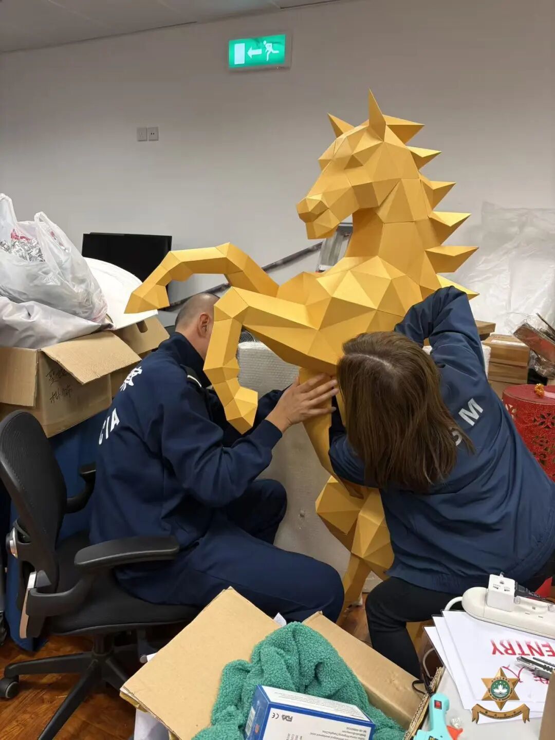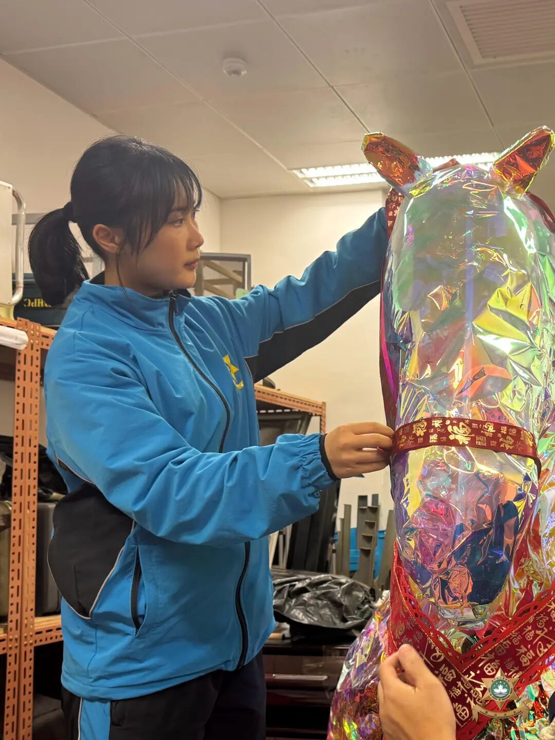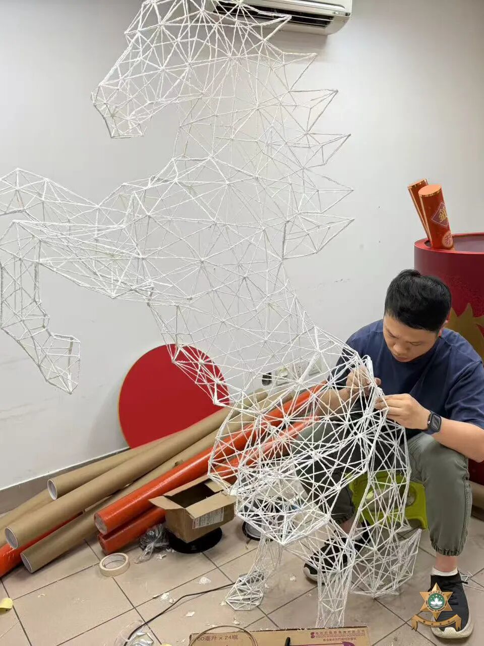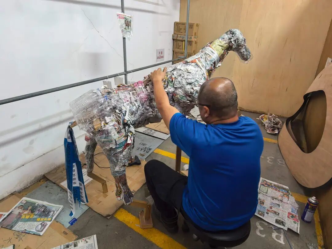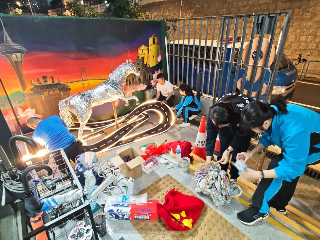 交通廳2026馬年新春裝飾以“駿馬、道路、全速通行”為設計主軸,馬身採用木條塑形,搭配膠樽填充工藝,並覆以銀錫紙修飾。