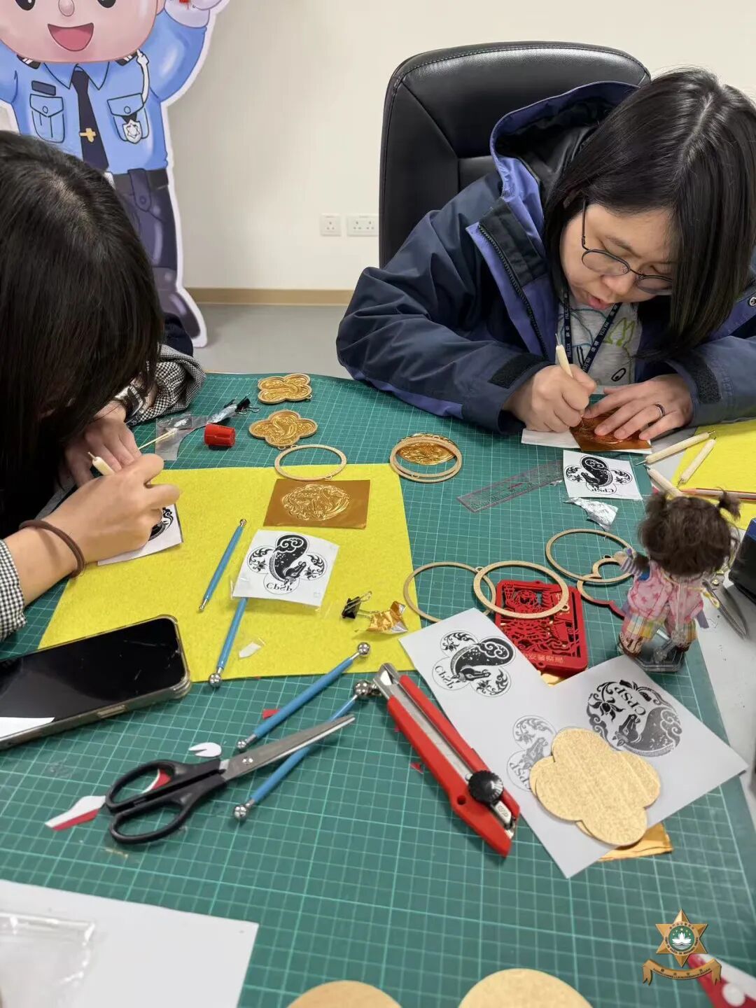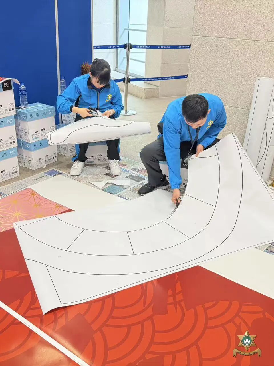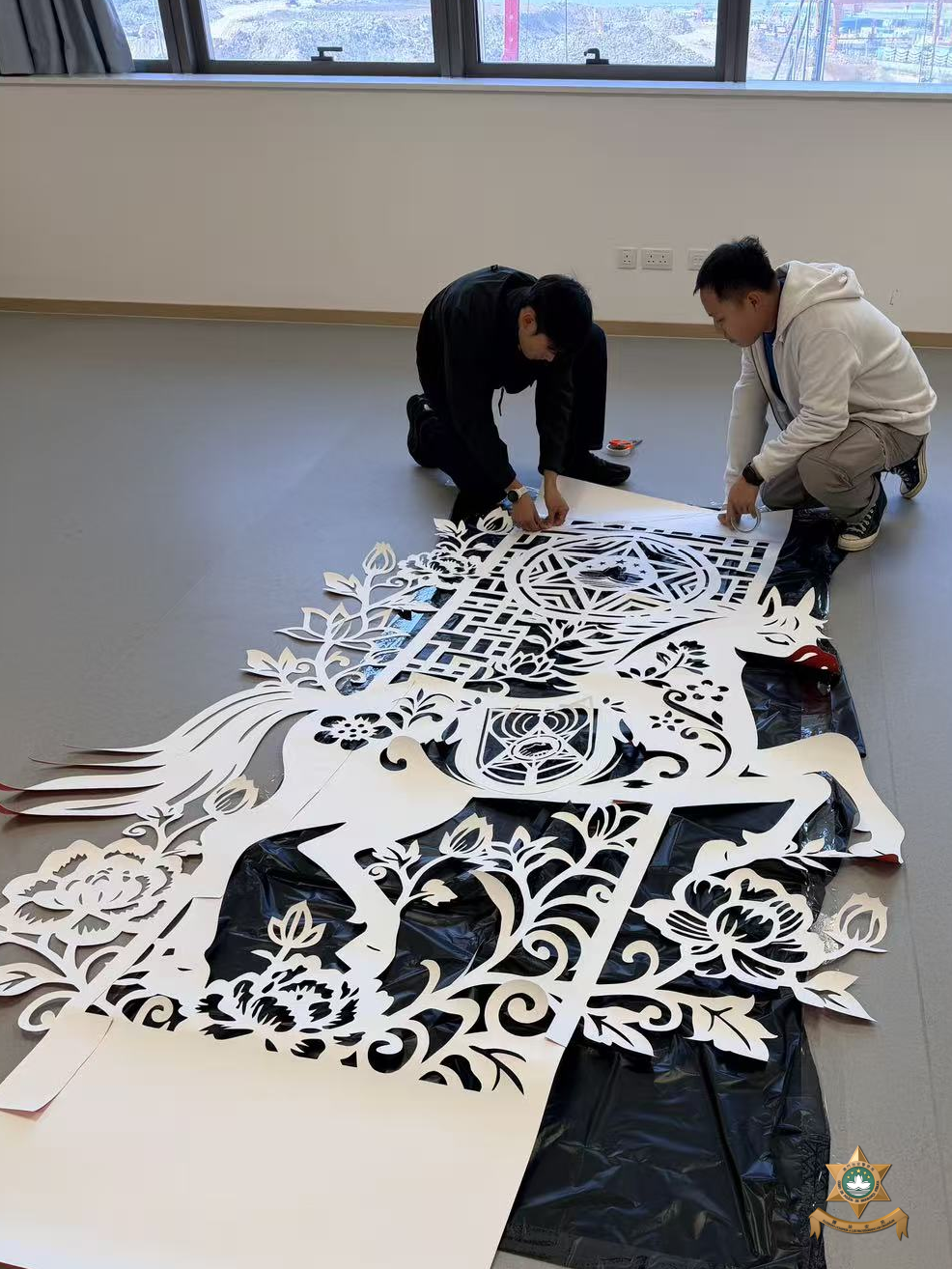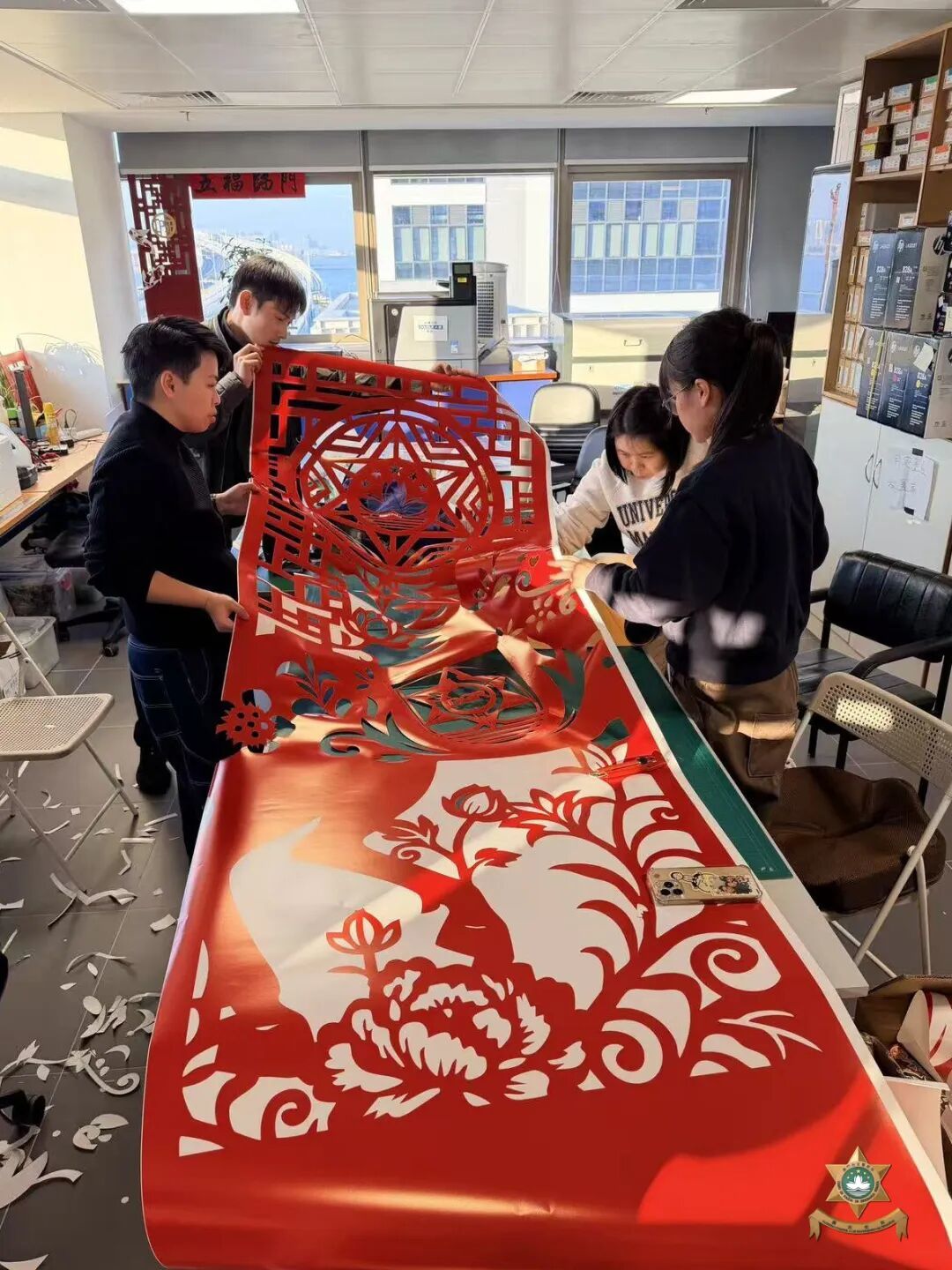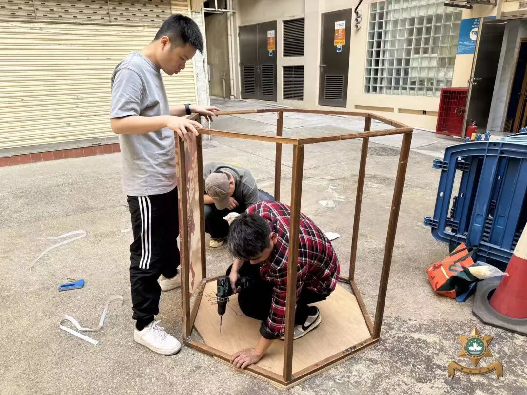 新春裝飾設計以中國世界非物質文化遺產——剪紙為主要元素。在昔日民間習俗中,人們常將象徵吉祥如意、家宅平安的剪紙張貼於門窗之上,這種美好的寓意,與本局警察宣傳的“慎門户,保平安”安全理念不謀而合。因此,我們以中國傳統美學為表達形式,傳遞澳門警察廉潔高效的精神內涵。設計過程中,我們在注重作品設計感的同時,亦合理選用環保物料,充分利用資源、發揮創意巧思,最終在團隊成員的用心製作下順利完成作品。