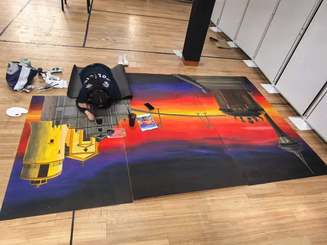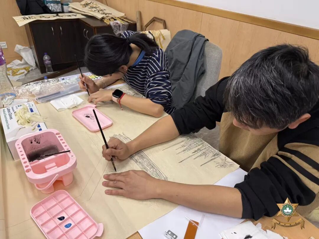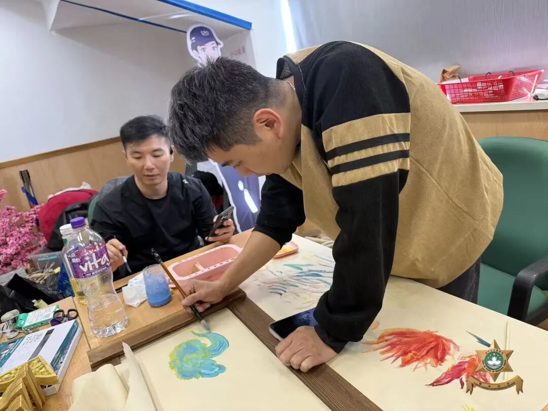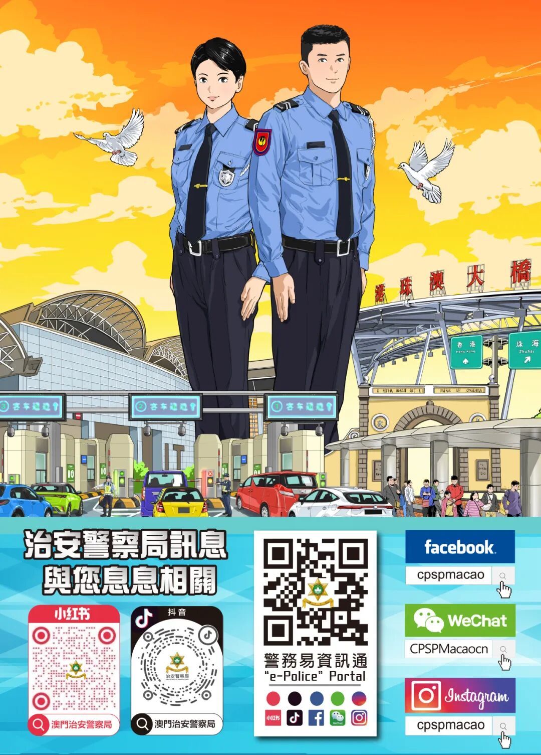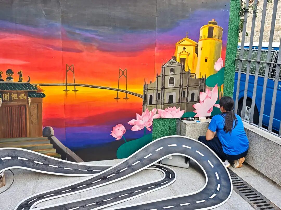 中央躍馬昂首奔馳、四蹄生風,象徵交警隊伍迅捷果斷的專業執法精神;其腳下蜿蜒發光的跑道,寓意道路通行有序、暢通無阻。背景處繪製大三巴、媽閣廟及觀光塔等澳門標誌性地標,將澳門古今交融的獨特風華與平安交通的核心理念有機融合,生動展現出警民同心、路暢城安的美好願景。