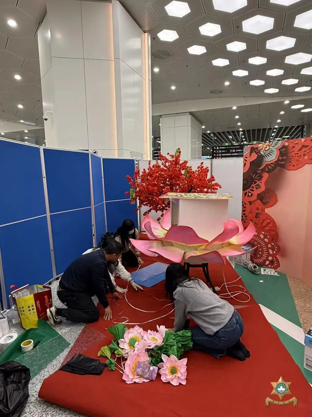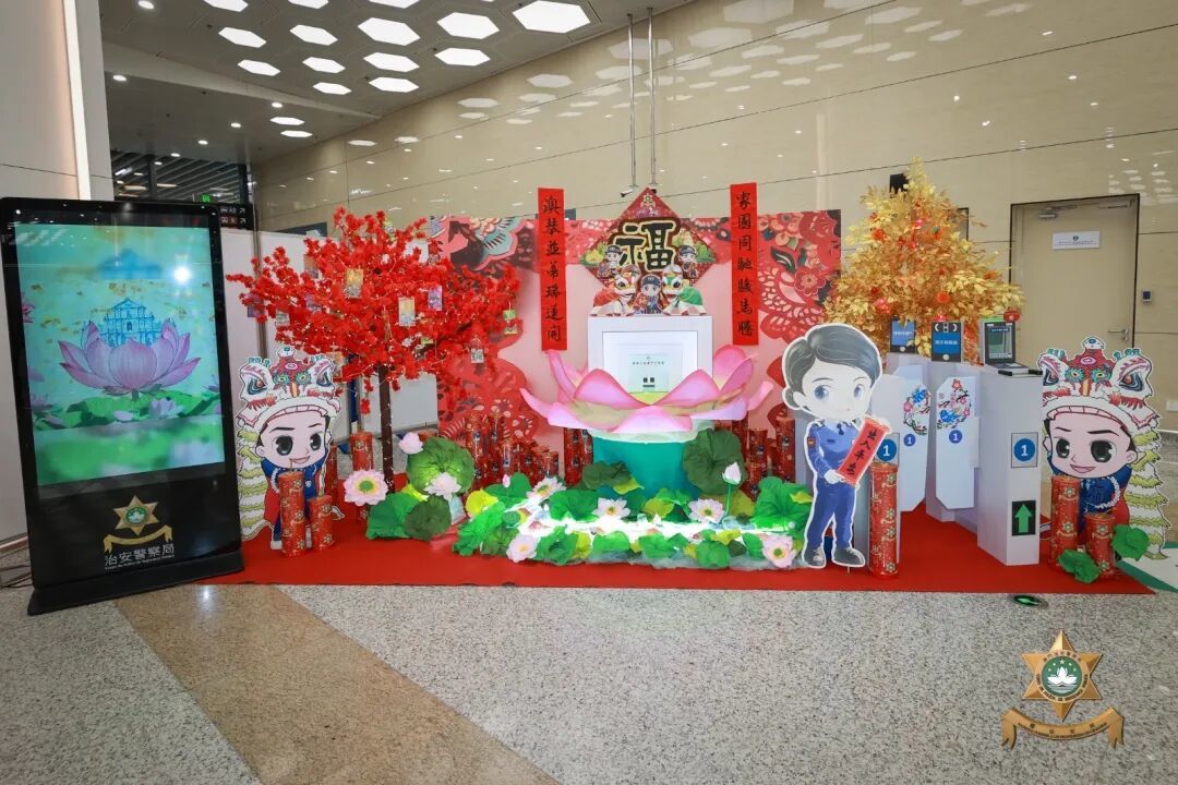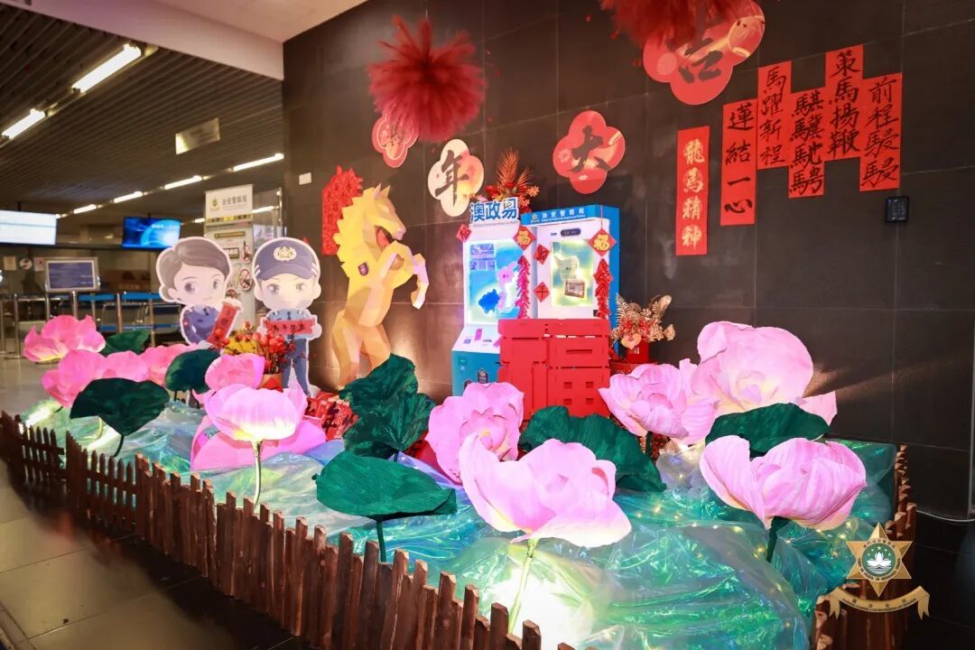出入境管制廳2026馬年新春裝飾以“蓮·結”為主題。以“蓮”致敬舊蓮花口岸向現代化橫琴口岸的華麗蜕變,以等比還原的“免出示證件通關”模型作為“結”,具象化展現澳琴兩地協作創新、精益求精的建設成果。金樹與桃花寓意堅守與融合,映現橫琴口岸凝聚警民力量、匯聚兩地同心的擔當,既守護通關暢通無阻,也共促澳琴繁榮發展,生動詮釋“蓮結一心,共護城安”的核心設計理念。