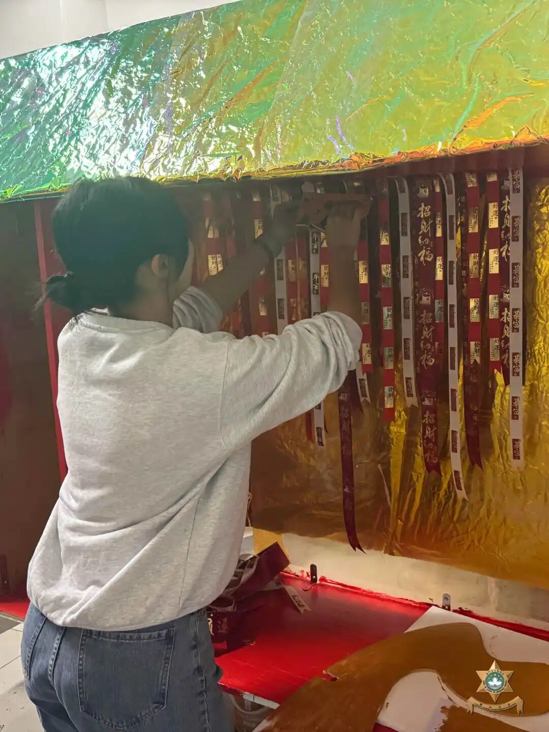 色彩相間的燈籠高掛其側,層層點綴、錯落有致,交織出熱鬧而有序的節慶節奏。整體設計以紅金色系為基礎,融合流動線條與傳統元素,讓農曆新年的温馨祝福隨空間延展,喜迎嶄新的一年。