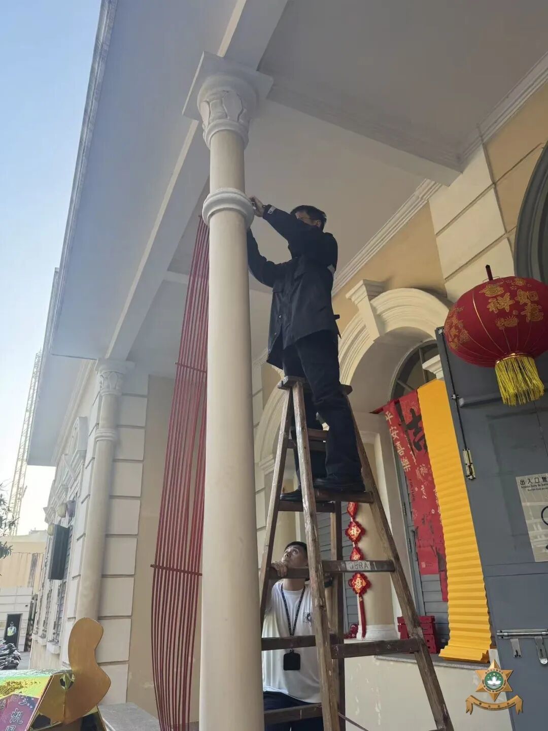 新春裝飾以中式建築為整體主軸,象徵傳承與守護,寓意警務工作如屋脊般承託社會安定,歷久彌堅、穩固不移。
