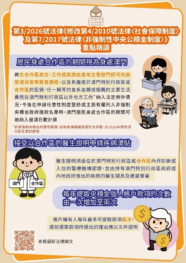 為了確保受惠對象與澳門有較緊密聯繫,維護公帑的合理運用,澳門社會保障制度中的任意性制度登錄及非強制央積金政府撥款均有身處澳門最少183日的要求。是次修法的重點之一,在於明確將澳門居民身處橫琴粵澳深度合作區(下稱“合作區”)的特定情況,包括將在合作區居住、工作或就讀由當地主管部門認可的高等或非高等教育課程,以及因負擔居於合作區的親屬主要生活費而在澳門以外地方工作等原因,納入法定例外情況,以便在處理上述兩項社保權益時,澳門居民身處合作區的期間可視為身處澳門。同時,將申請社會保障制度疾病津貼所需醫生證明文件的認受範圍擴展至合作區。在非強制性中央公積金制度款項提取方面,修訂後的法律允許帳户擁有人每年可提取款項的次數增至2次。