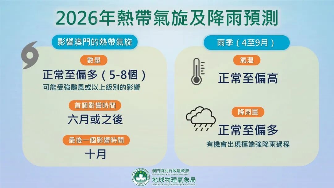 根據最新的海洋觀測及預報資料顯示,「拉尼娜」狀態正逐漸緩和,春季將有機會回復至「ENSO中性」狀態,並在夏季進入「厄爾尼諾」狀態。地球物理氣象局預測今年(2026年)約有5至8個熱帶氣旋影響澳門,數量正常至偏多,且可能受強颱風或以上級別影響,預料風季將在6月或之後開始,10月結束。同時,預測今年雨季(4至9月)的平均氣温屬正常至偏高,累積降雨量屬正常至偏多,並可能出現極端強降雨過程。
