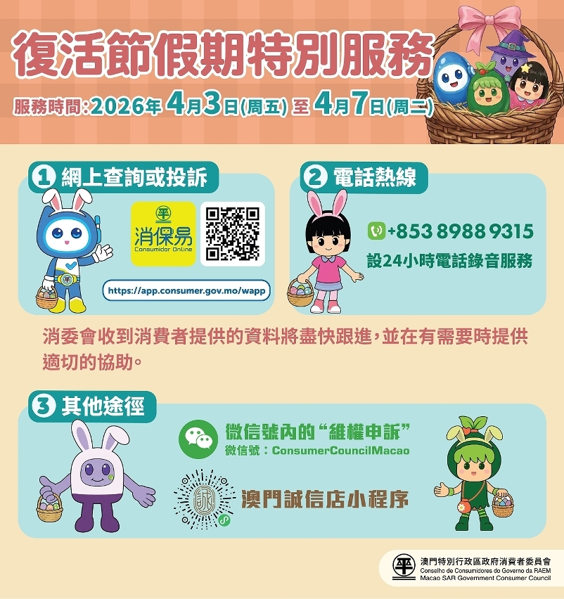 消費者委員會配合復活節連假,由4月3日至7日設假期特別服務,為消費者提供查詢或投訴服務。