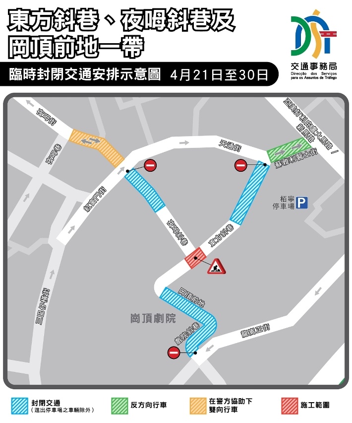 配合市政署路面維修工作,並合併專營公司的水管鋪設工程,東方斜巷、夜呣斜巷、岡頂前地一帶4月16日起將分階段實施臨時交通安排,當中21日至30日部份路段需臨時封閉交通(詳見附圖)。工程期間,將同步實施反方向行車、有限度通車,以及部份路段在警方協助下實施雙向行車等措施,詳情請見附表,敬請駕駛者留意。