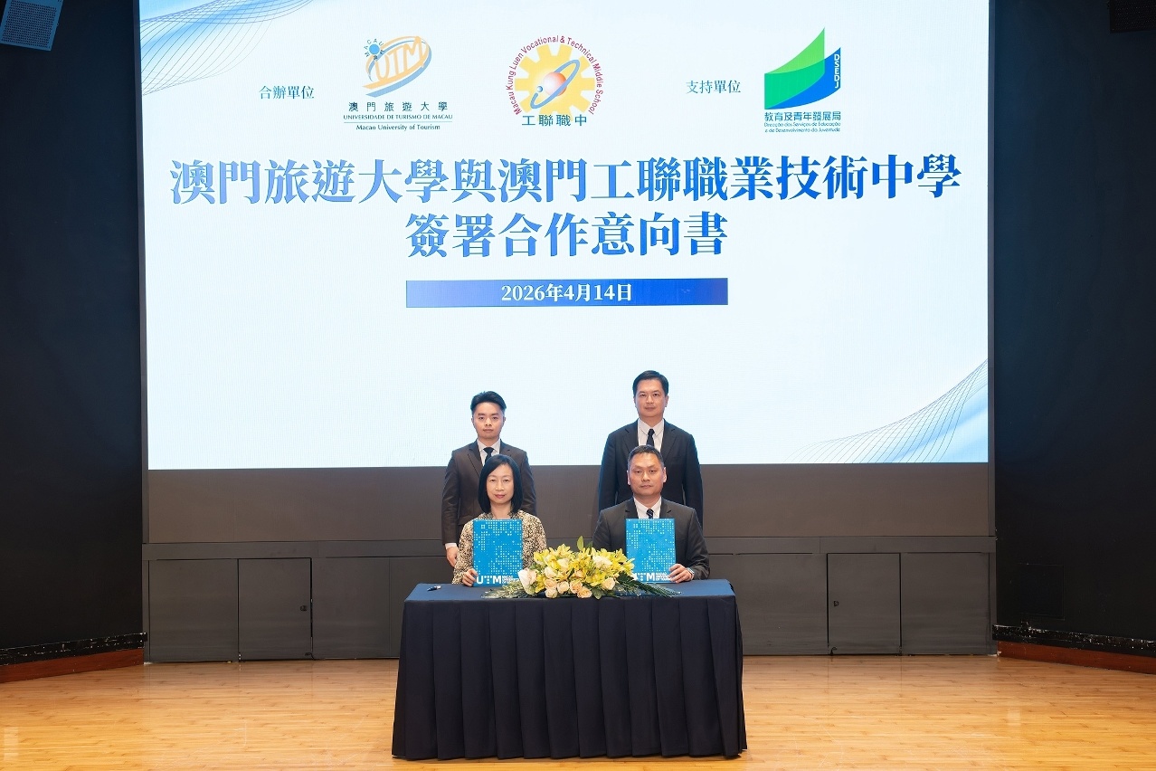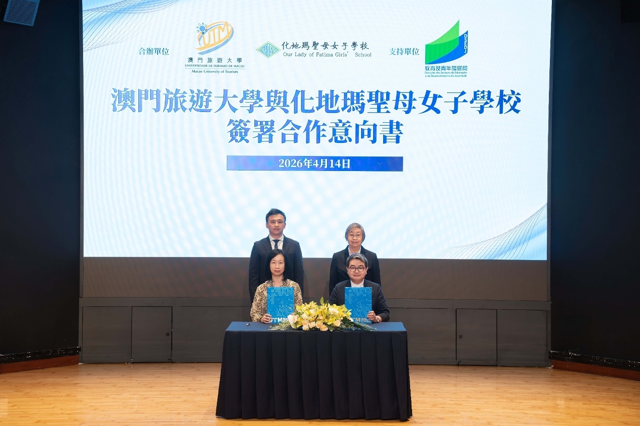 為配合澳門特別行政區政府推動職業教育發展政策,深化高等教育與基礎教育協作,培育澳門經濟適度多元發展所需的專才,在教育及青年發展局的支持下,澳門旅遊大學於4月14日與化地瑪聖母女子學校、聖若瑟教區中學第五校、新華夜中學、澳門工聯職業技術中學舉行合作意向書簽署儀式,為四所中學量身訂製高中職業教育課程。